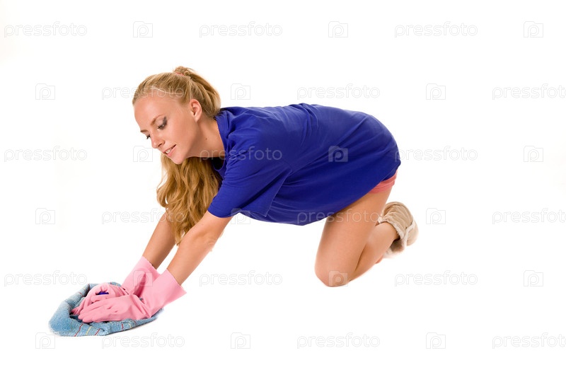 Молодая домохозяйка в резиновых перчатках моет пол