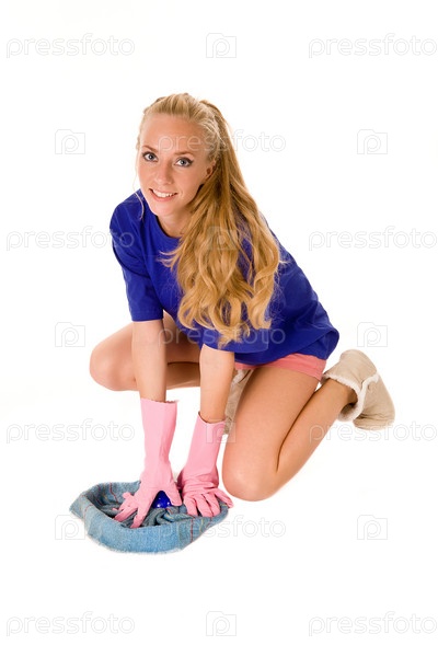 Молодая домохозяйка в резиновых перчатках моет пол