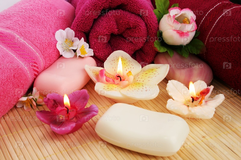 Полотенца, мыло, цветы и свечи на фоне бамбуковой салфетки