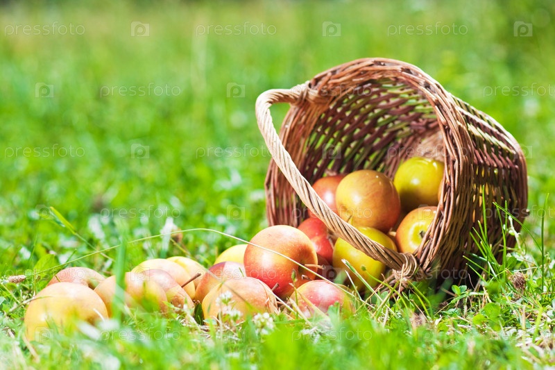 Спелые яблоки в корзине на траве