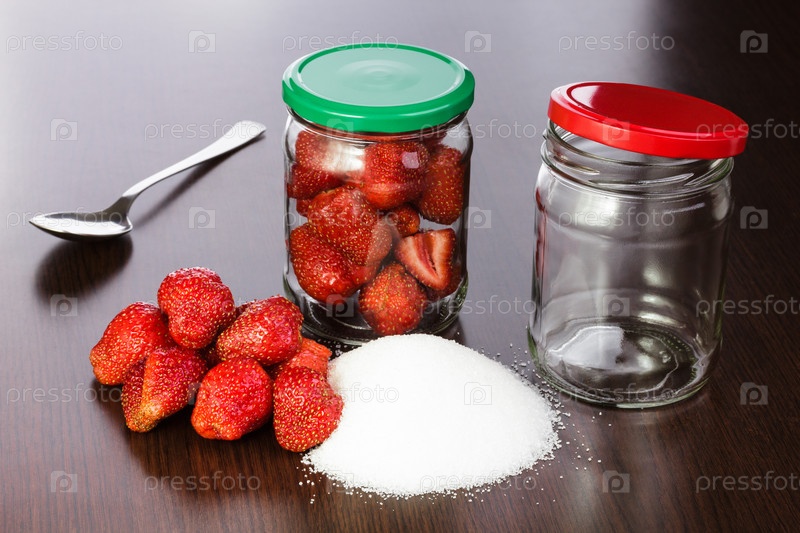 Клубника, горстка сахара и пустая банка для консервирования