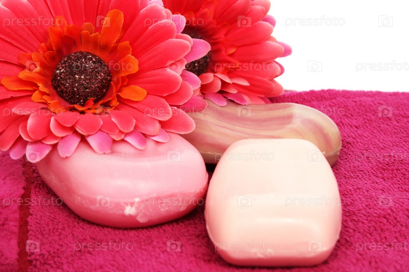 Полотенца, мыло и цветы на белом фоне