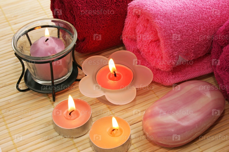 Полотенца, свечи, мыло на фоне коврика