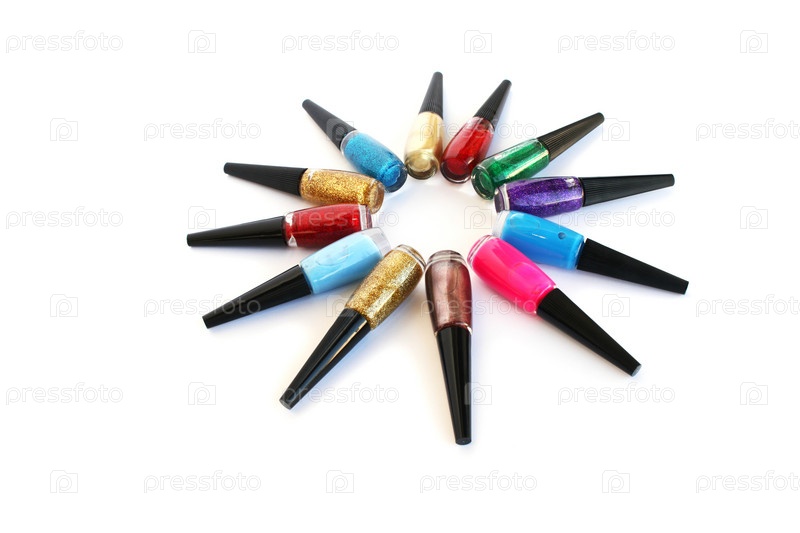 Разноцветные лаки для ногтей на белом фоне