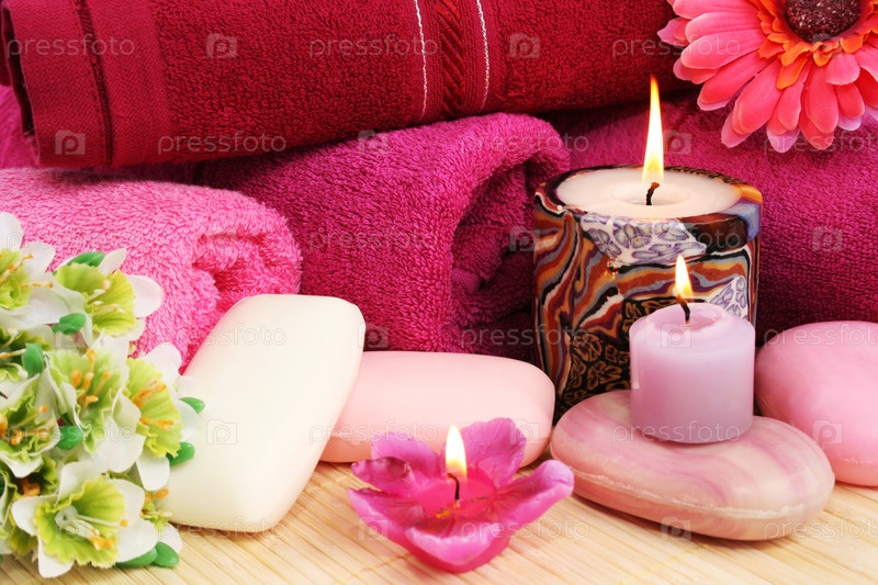 Полотенца, мыло, цветы и свечи на фоне коврика