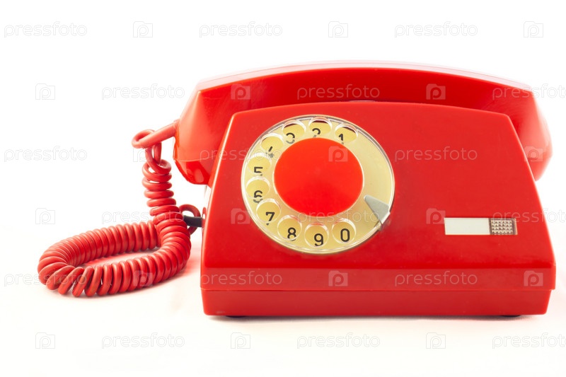 Старый красный пластиковый телефон на белом фоне