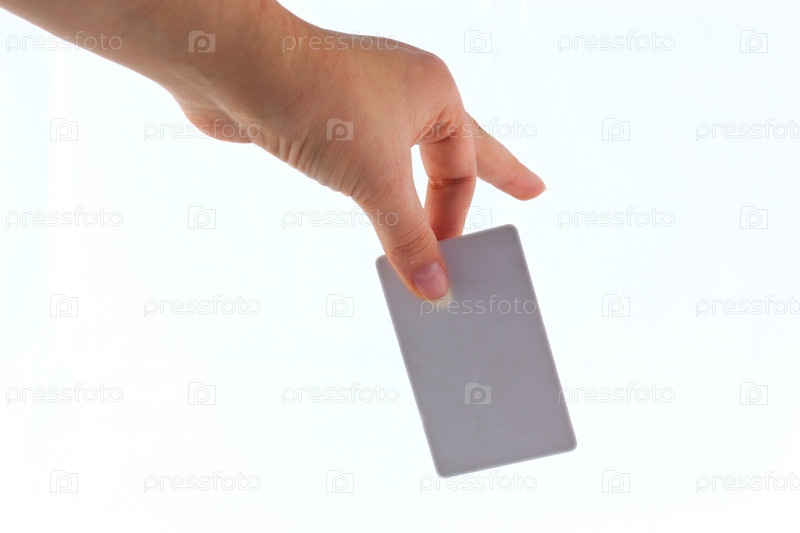 Пластиковая банковская карта в руке на белом фоне