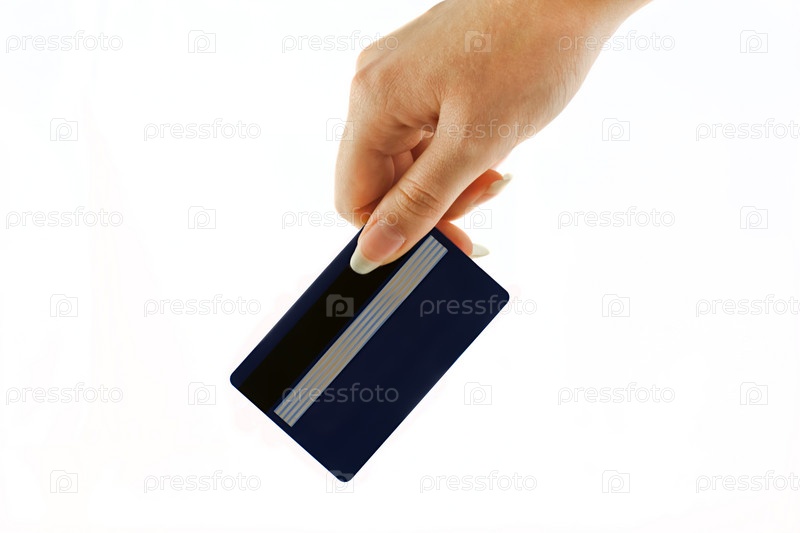 Пластиковая банковская карта в руке на белом фоне