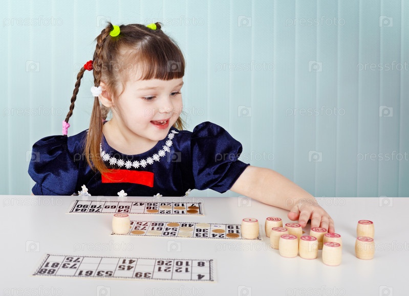 Маленькая девочка играет в лото, сидя за столом