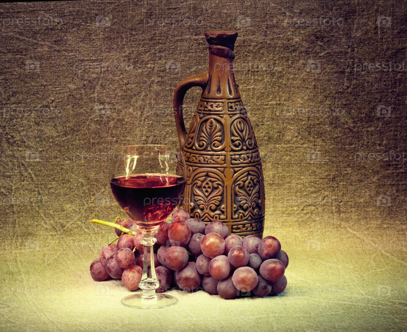 Темный Натюрморт - глиняная бутылка, бокал и виноград