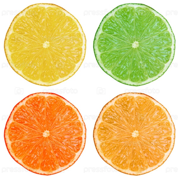 Ломтики разных цитрусовых фруктов на белом фоне