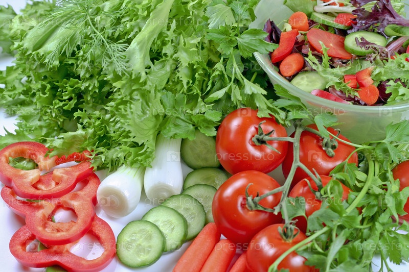 Натюрморт с различными овощами, зеленью и миска салата