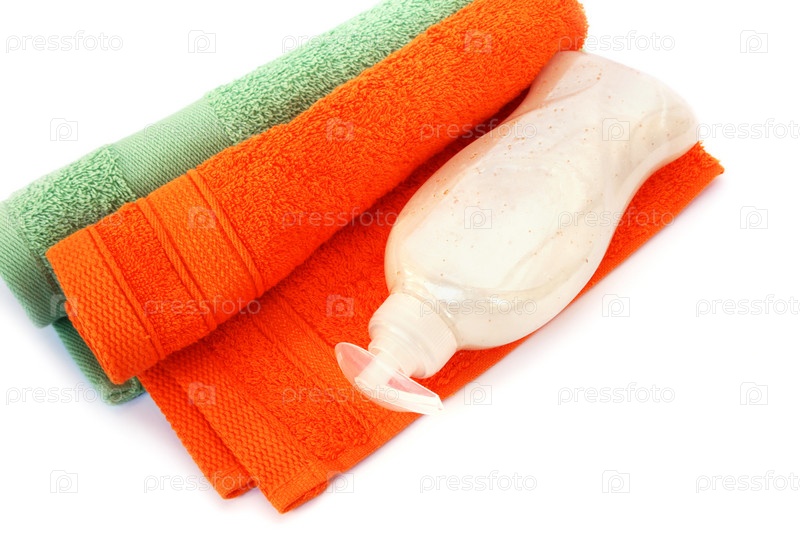 Бутылка жидкого мыла и полотенца, изолированные на белом фоне
