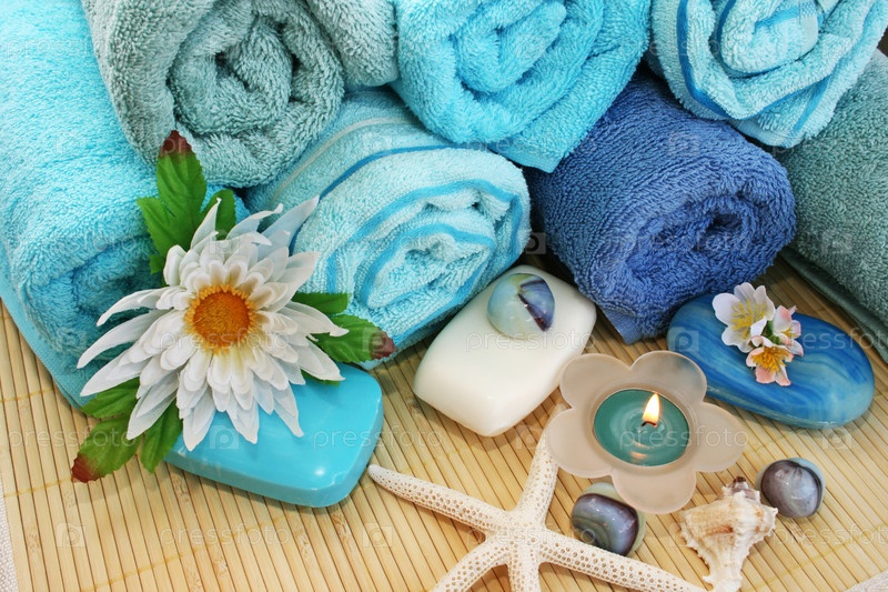 Полотенца, мыло, цветы и свечи на фоне бамбуковой салфетки крупным планом