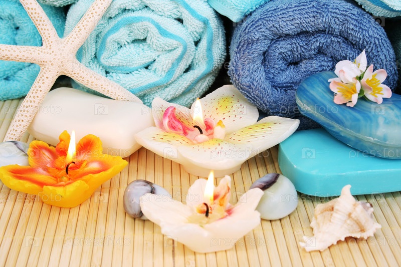 Полотенца, мыло, цветы и свечи на фоне бамбуковой салфетки крупным планом