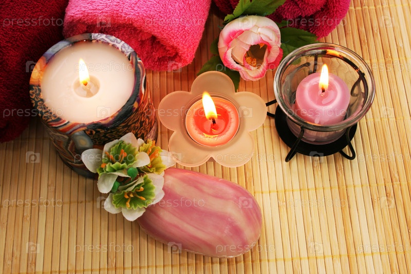 Полотенца, мыло, цветы и свечи на фоне бамбуковой салфетки крупным планом