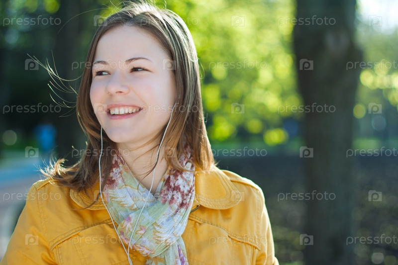 Молодая женщина прогуливается, слушая музыку