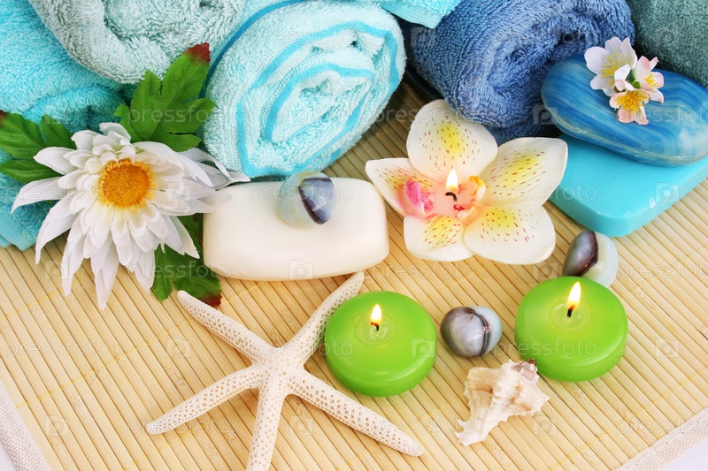 Полотенца, мыло, свечи, камни, цветы на фоне бамбуковой салфетки