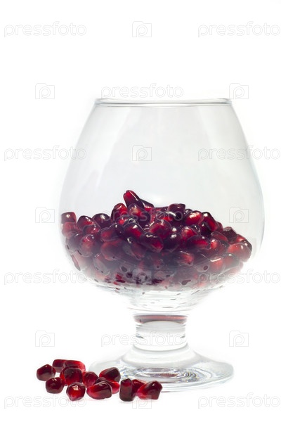 Семена граната в прозрачном стакане на белом фоне