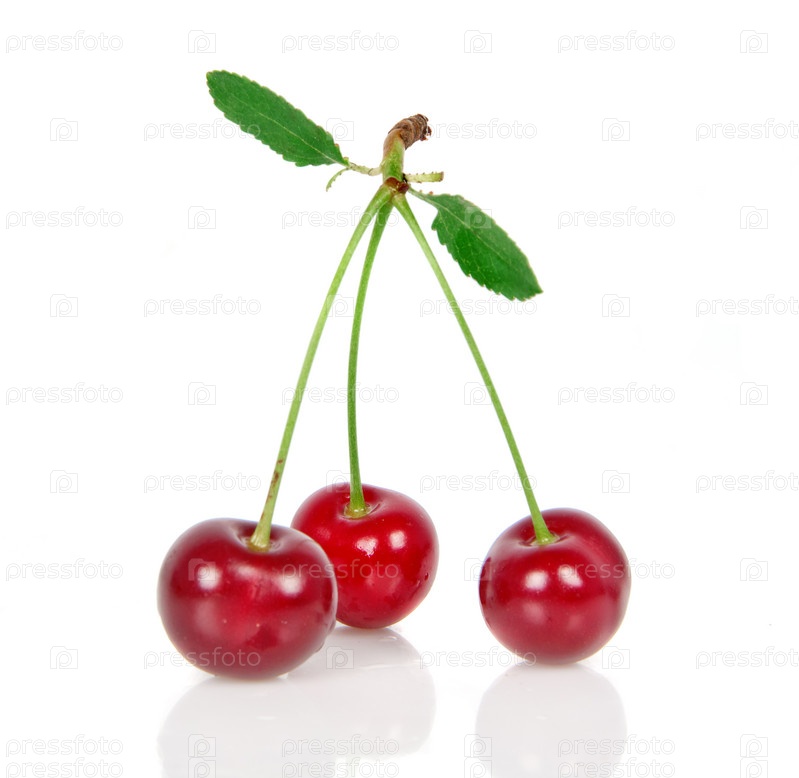 Ягоды вишни с листьями на белом фоне