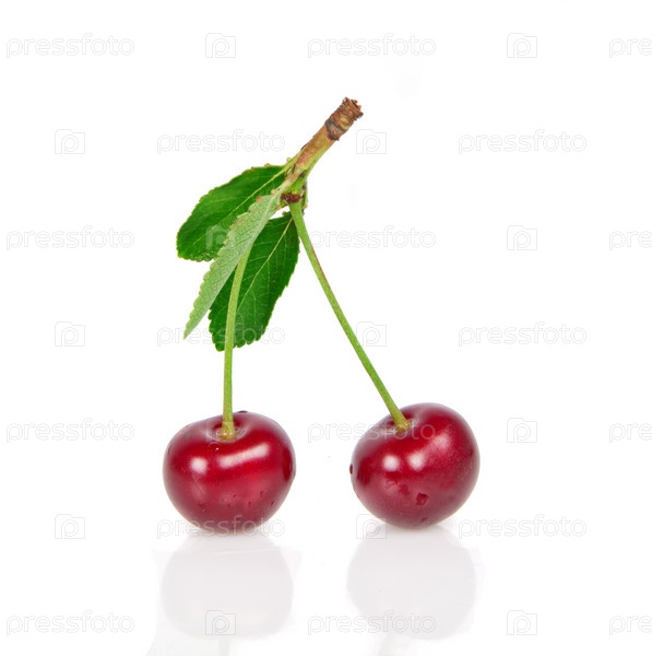 Ягоды вишни с листьями на белом фоне