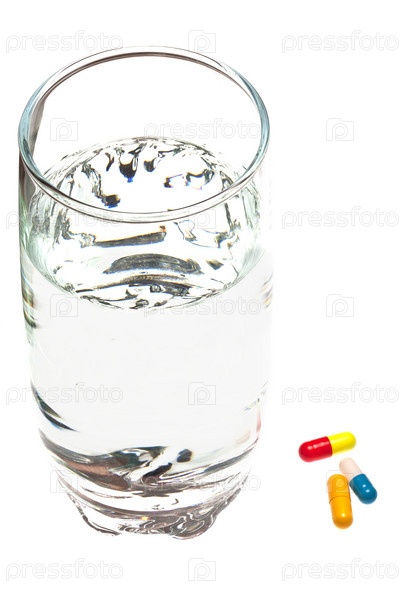 Стакан воды и таблетки на белом фоне