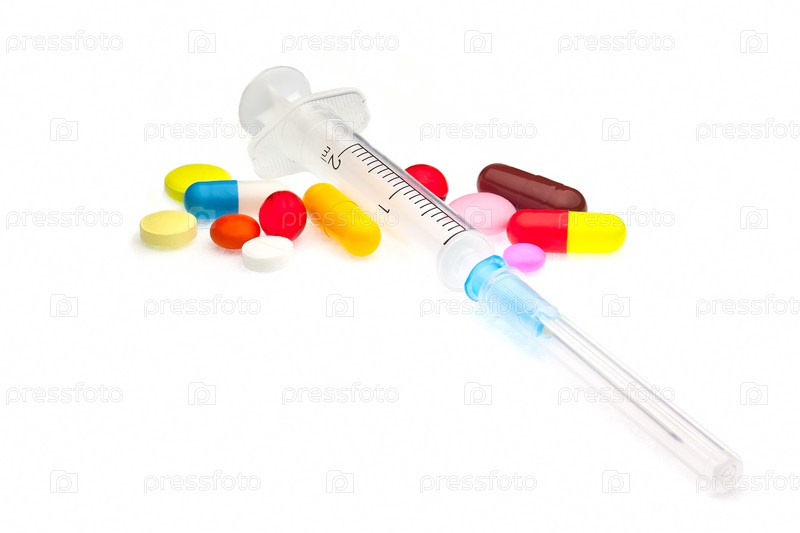 Множество различных таблеток и шприц, изолированные на белом фоне