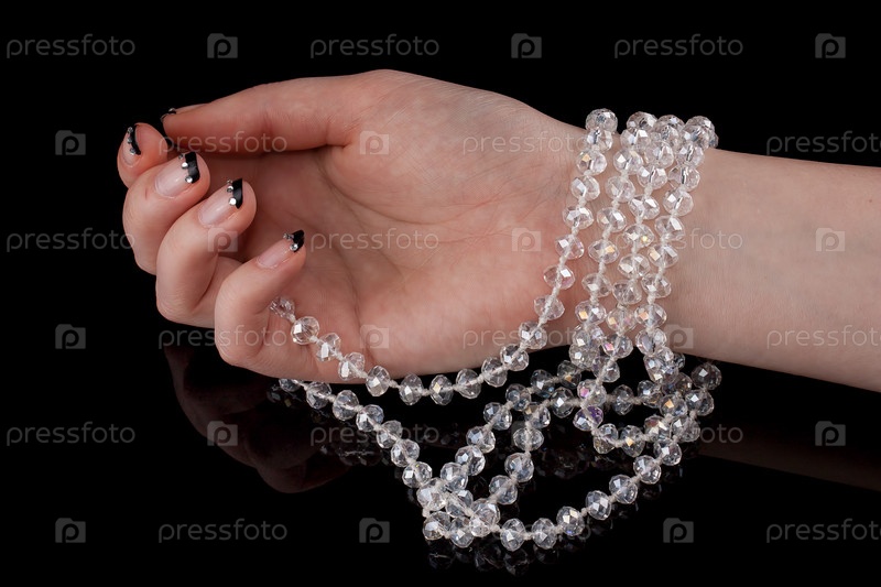 Красивые бусы на руке на черном фоне