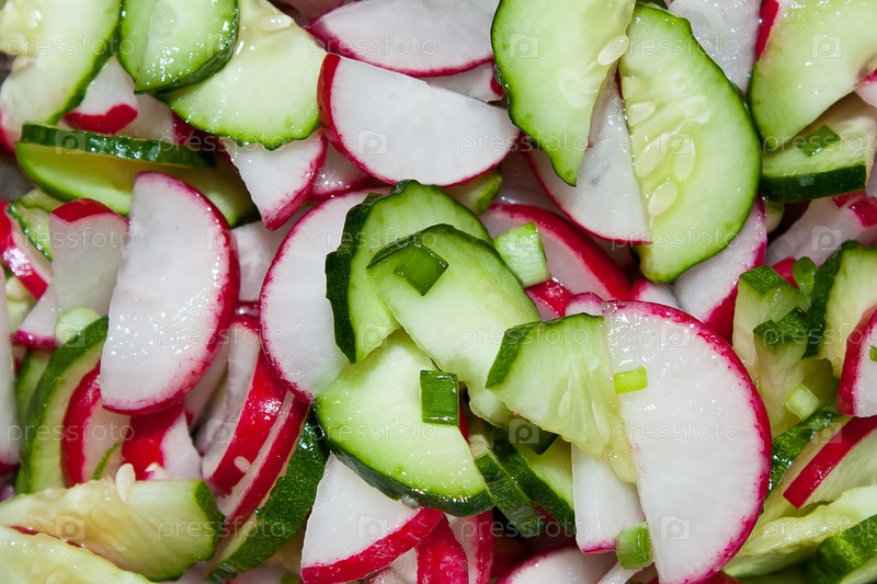 Салат с огурцами, редисом и луком крупным планом
