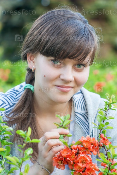 Портрет симпатичной девушки на фоне цветов