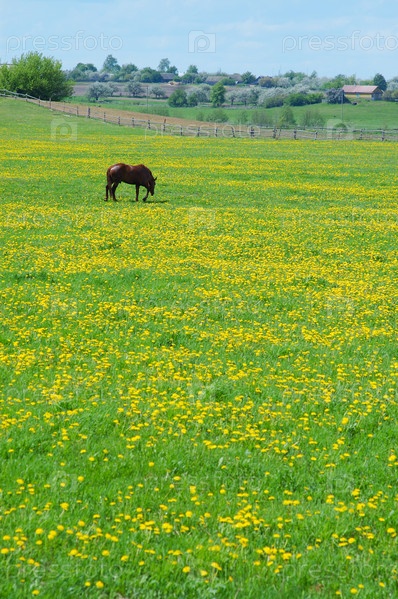 Лошадь, пасущаяся на весеннем лугу, заросшем цветами одуванчика