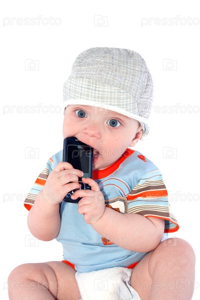 Маленький ребенок жует мобильный телефон, на белом фоне