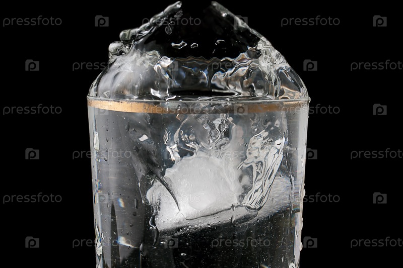Кубик льда падает в стакан воды, красивые брызги на черном фоне