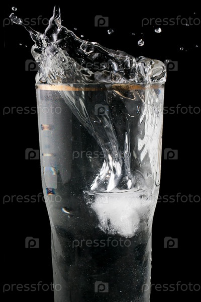 Кубик льда падает в стакан воды, красивые брызги на черном фоне