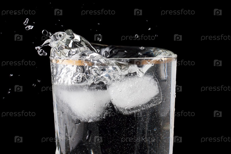 Кубик льда падает в стакан воды, красивые брызги на черном фоне