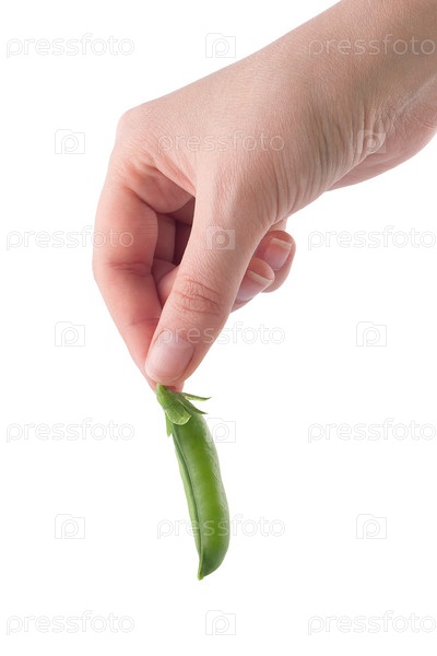 Рука женщины со стручком гороха на белом фоне