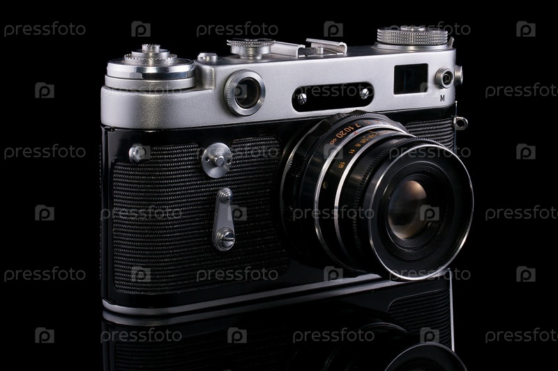 Старый дальномерный фотоаппарат, изолированный на черном фоне