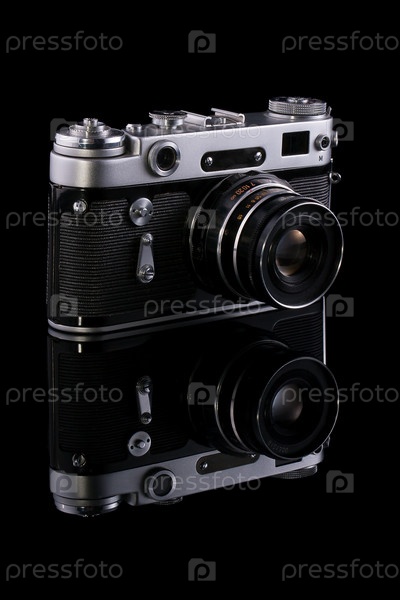 Старый дальномерный фотоаппарат, изолированный на черном фоне