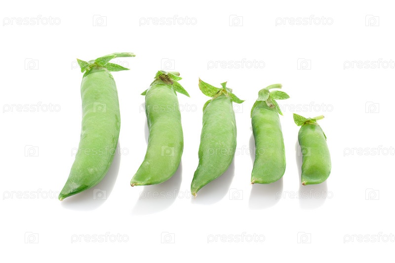 Пять стручков зеленого горошка различных размеров на белом фоне