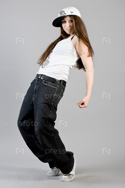 Молодая танцующая девушка в джинсах