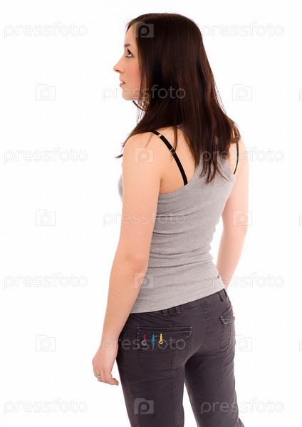 Девушка в серой майке и черных брюках на белом фоне