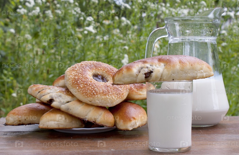 Аппетитные румяные домашние пирожки и парное молоко в летнем саду