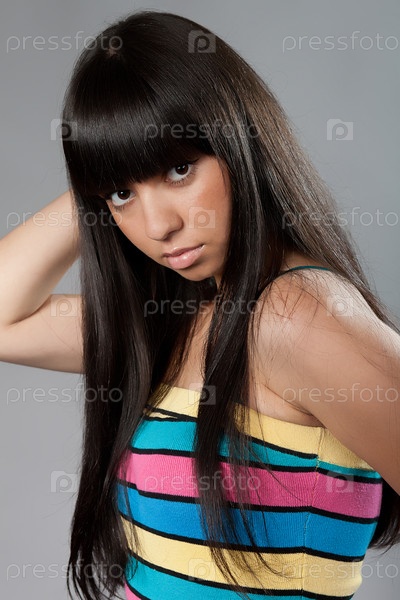 Красивая длинноволосая брюнетка на сером фоне