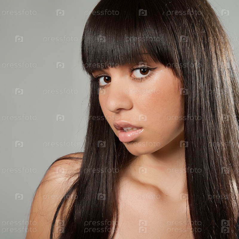 Красивая длинноволосая брюнетка на сером фоне