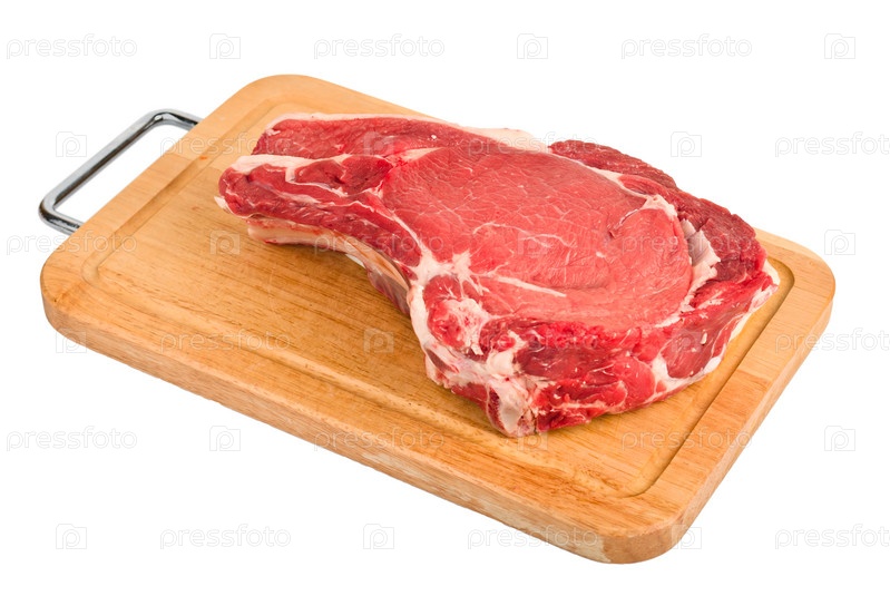 Один кусок сырого мяса на деревянной доске, изолированной на белом фоне