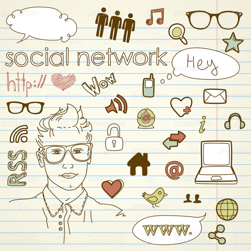 Мужчина в очках и различные иконки с надписью "социальная сеть"