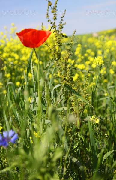 Рапсовое поле и красный мак под голубым небом