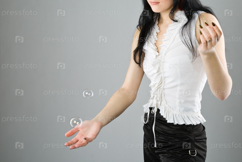 Молодая красивая девушка ловит мыльный пузырь на сером фоне