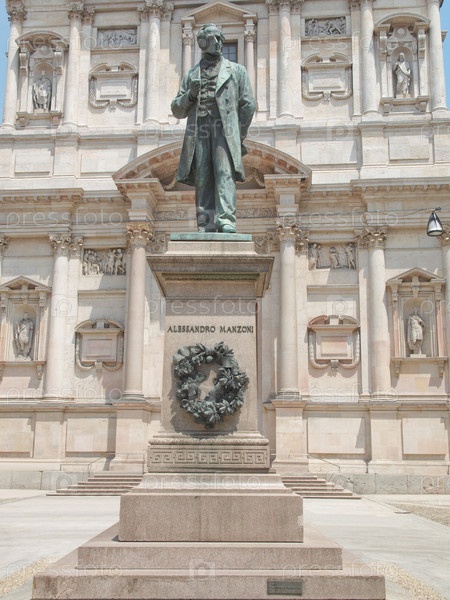 Статуя писателя Алессандро Мандзони напротив церкви Сан Феделе, Милан, Италия