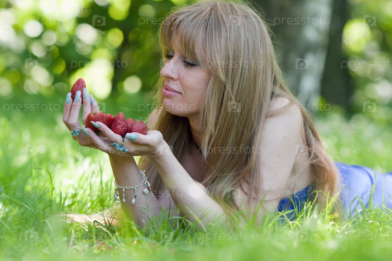 Женщина с клубникой на траве